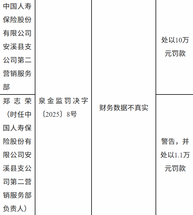 11月25日,泉州金融监管分局行政处罚信息公示表显示,中国人寿保险股份有限公司安溪县支公司第二营销服务部因财务数据不真实被罚款10万元;郑某荣被警告并罚款1.1万元。
